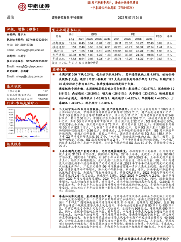 【中泰证券】【20220724】20220724-中泰证券-中泰通信行业周报:5G用户渗透率提升,海南加快海风建设-20页 行业研究