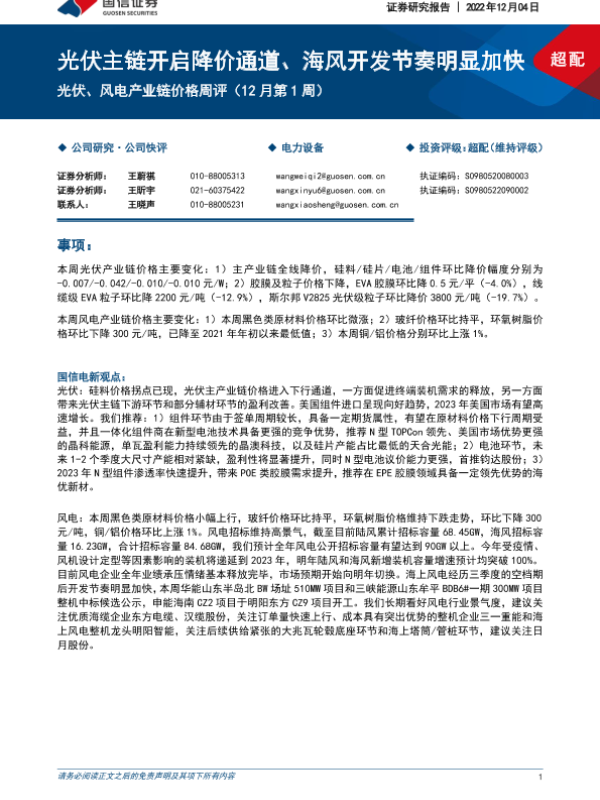 【国信证券】【20221204】光伏、风电产业链价格周评(12月第1周):光伏主链开启降价通道、海风开发节奏明显加快-13页 行业研究