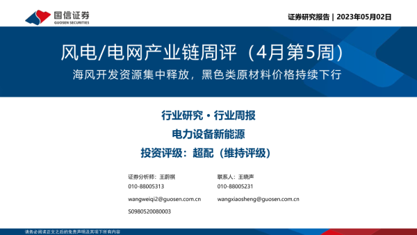 【国信证券】【20230502】风电/电网产业链周评(4月第5周):海风开发资源集中释放,黑色类原材料价格持续下行-26页 行业研究