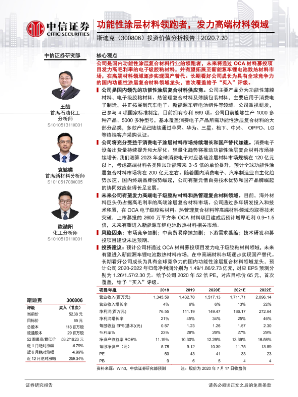 【中信证券】【20200720】20200720-中信证券-斯迪克-300806.SZ-投资价值分析报告:功能性涂层材料领跑者,发力高端材料领域-33页 行业研究