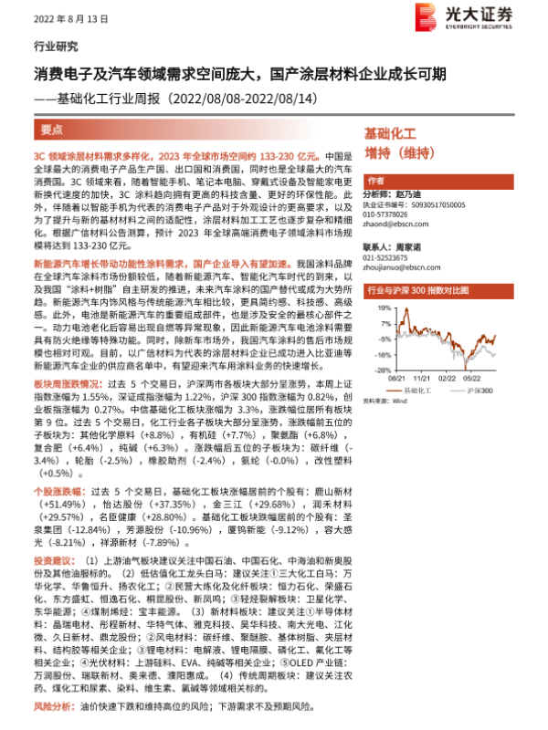 【光大证券】【20220813】基础化工行业周报:消费电子及汽车领域需求空间庞大,国产涂层材料企业成长可期-31页 行业研究