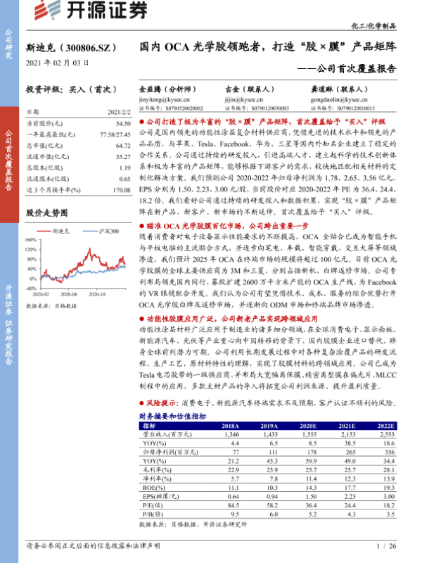 【开源证券】【20210203】斯迪克-300806.SZ-公司首次覆盖报告:国内OCA光学胶领跑者,打造“胶×膜”产品矩阵-26页 证券期货研究报告
