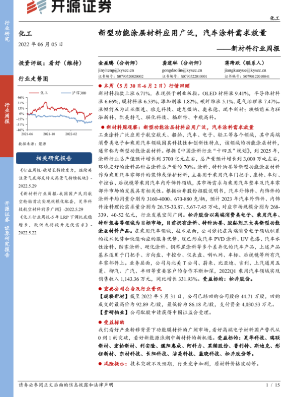 【开源证券】【20220605】新材料行业周报:新型功能涂层材料应用广泛,汽车涂料需求放量-15页 行业研究