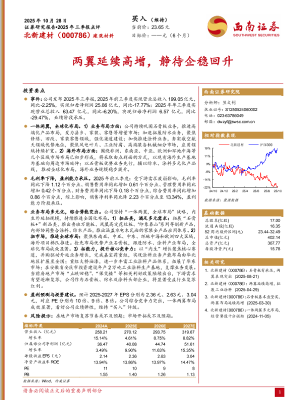 【西南证券】【202510】北新建材(000786):两翼延续高增,静待企稳回升-5页 证券期货研究报告