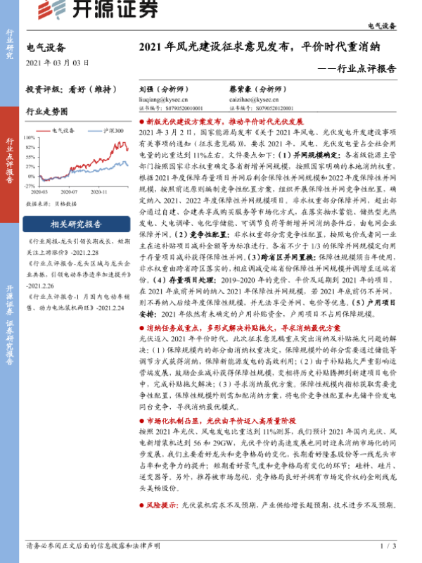 【开源证券】【20210303】2021年风光建设征求意见发布,平价时代重消纳-3页 证券期货研究报告