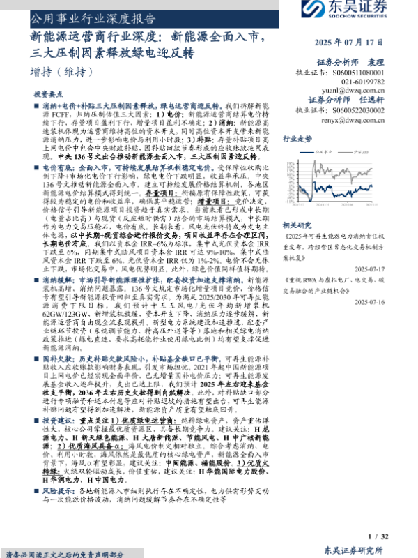 【东吴证券】【20250717】公用事业行业深度报告:新能源运营商行业深度,新能源全面入市,三大压制因素释放绿电迎反转-32页 证券期货研究报告