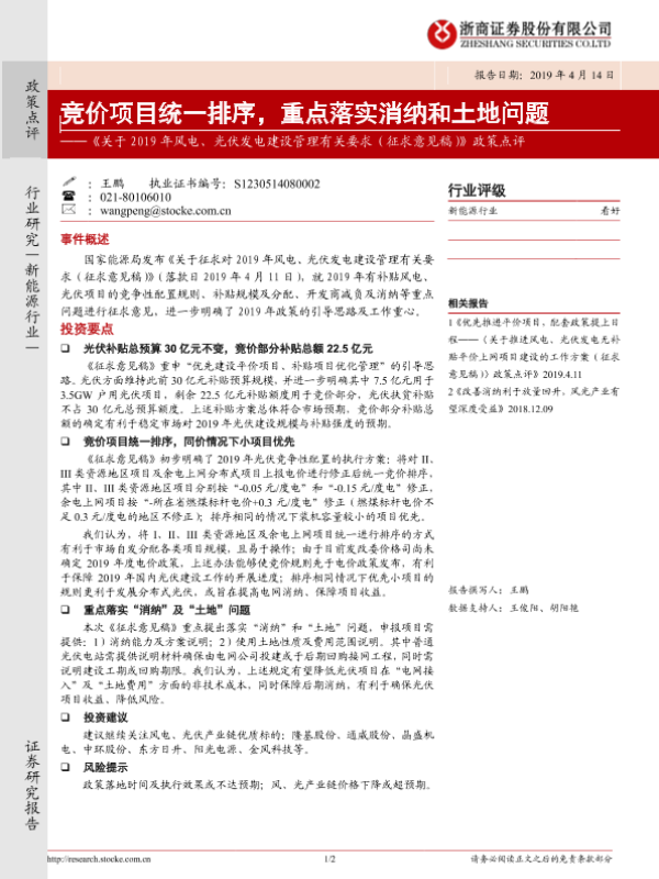 【浙商证券】【20190414】关于2019年风电、光伏发电建设管理有关要求(征求意见稿)政策点评-2页 行业研究