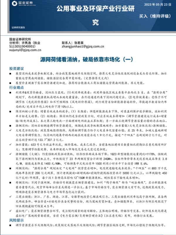 【国金证券】【20230523】公用事业及环保产业行业研究:源网荷储看消纳,破局依靠市场化(一)-29页 行业研究