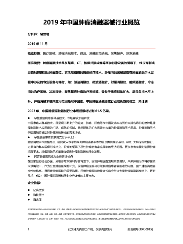 【头豹研究院】【201911】2019年中国肿瘤消融器械行业概览-36页 行业研究