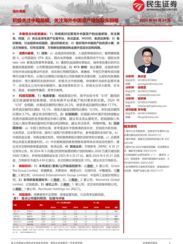 【民生证券】【20240624】海外周报:积极关注中报前瞻,关注海外中国资产增加股东回报-19页 行业研究
