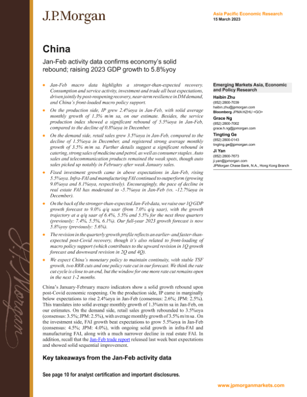 【J.P. Morgan】【20230315】Jan-Feb activity data confirms economy’s solid rebound; raising 2023 GDP growth to 5.8%yoy-13页 行业研究