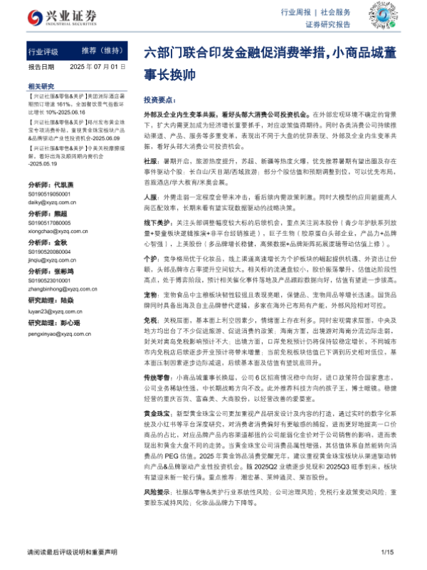 【兴业证券】【20250701】社会服务行业周报:六部门联合印发金融促消费举措,小商品城董事长换帅-15页 证券期货研究报告