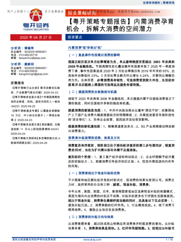 【粤开证券】【20200427】策略专题报告:内需消费孕育机会,拆解大消费的空间潜力-18页 行业研究
