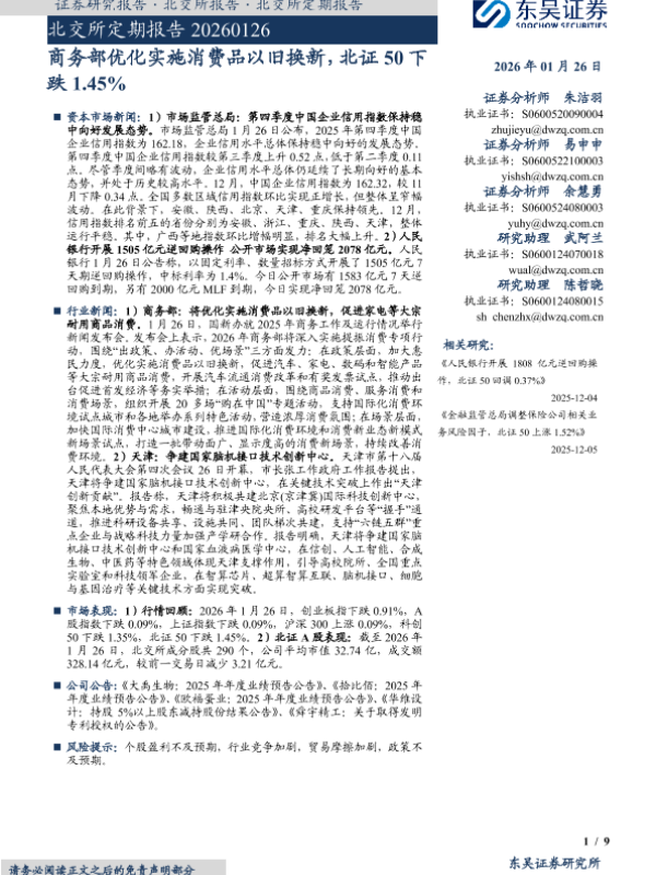 【东吴证券】【202601】商务部优化实施消费品以旧换新,北证50下跌1.45%-9页 证券期货研究报告