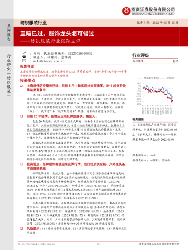 【浙商证券】【20220515】20220515-浙商证券-纺织服装行业跟踪点评:至暗已过,服饰龙头怎可错过-4页 行业研究