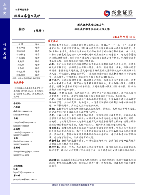 【兴业证券】【20240930】社服&零售&美护行业:国庆出游热度远超去年,社服美护零售多板块大幅反弹-15页 行业研究