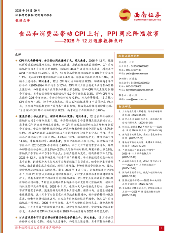 【西南证券】【202512】2025年12月通胀数据点评:食品和消费品带动CPI上行,PPI同比降幅收窄-8页 证券期货研究报告