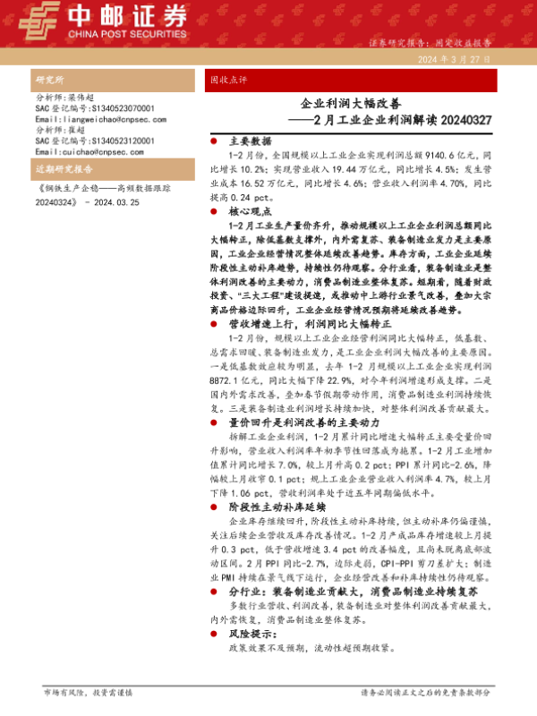 【中邮证券】【20240327】2月工业企业利润解读:企业利润大幅改善-11页 行业研究