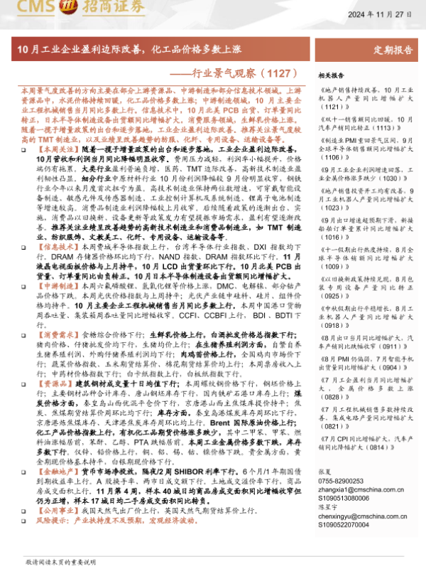 【海通证券】【20241127】行业景气观察:10月工业企业盈利边际改善,化工品价格多数上涨-31页 行业研究
