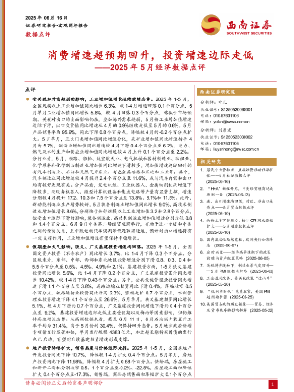 【西南证券】【20250616】2025年5月经济数据点评:消费增速超预期回升,投资增速边际走低-7页 证券期货研究报告