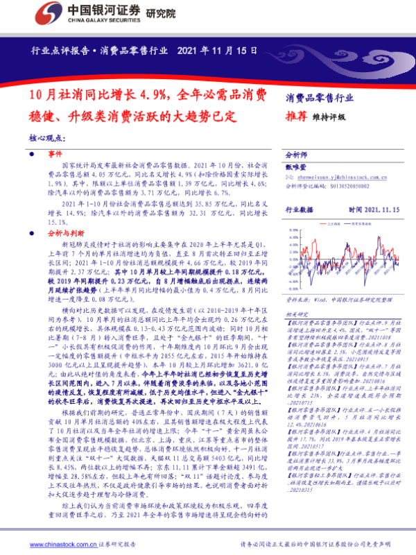 【银河证券】【20211115】10月社消同比增长4.9%,全年必需品消费稳健、升级类消费活跃的大趋势已定-6页 行业研究