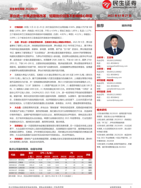 【民生证券】【20220327】民生食饮周报:茅台进一步推进营销改革,短期批价回落不影响核心刚需-16页 行业研究