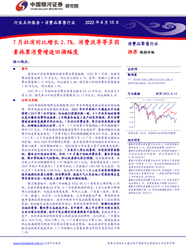 【银河证券】【20220815】7月社消同比增长2.7%,消费淡季等多因素拖累消费增速回调幅度-6页 行业研究