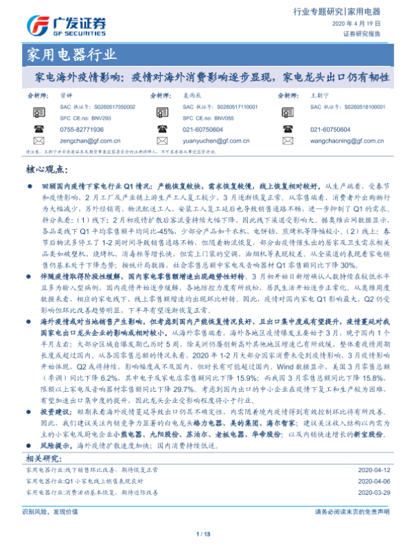 【广发证券】【20200419】家电海外疫情影响:疫情对海外消费影响逐步显现,家电龙头出口仍有韧性-13页 行业研究