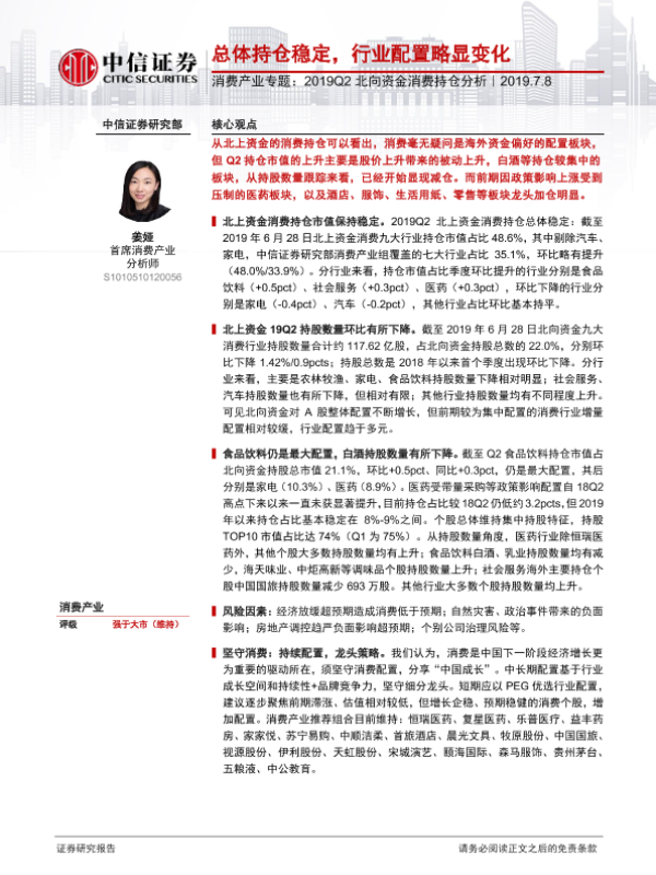 【中信证券】【20190708】2019Q2北向资金消费持仓分析:总体持仓稳定,行业配置略显变化-6页 行业研究