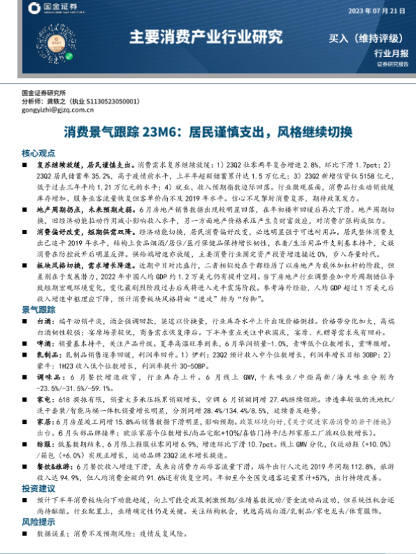 【国金证券】【20230721】主要消费产业行业研究:消费景气跟踪23M6-27页 行业研究