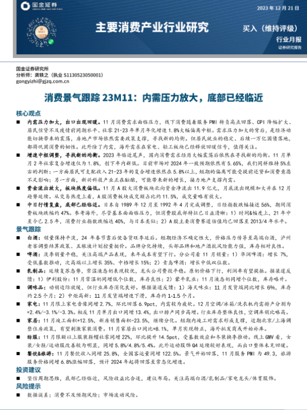 【国金证券】【20231221】主要消费产业行业研究:消费景气跟踪23M11:内需压力放大,底部已经临近-29页 行业研究