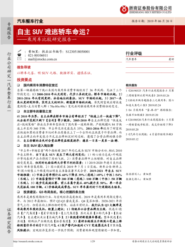 【浙商证券】【20190620】20190620-浙商证券-乘用车比较研究报告一:自主SUV难逃轿车命运?-29页 行业研究