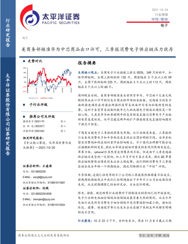 【太平洋证券】【20211024】电子行业周报:美商务部核准华为中芯商品出口许可,三季报消费电子供应链压力犹存-15页 行业研究