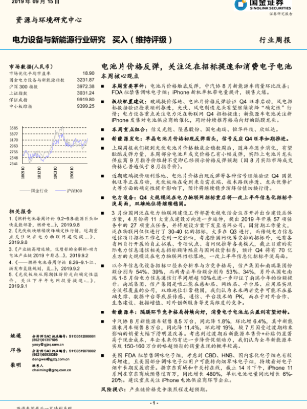 【国金证券】【20190915】电力设备与新能源行业研究:电池片价格反弹,关注泛在招标提速和消费电子电池-4页 行业研究