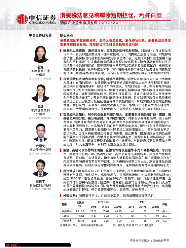 【中信证券】【20191204】消费产业重大事项点评:消费税法意见稿解除短期担忧,利好白酒-2页 行业研究
