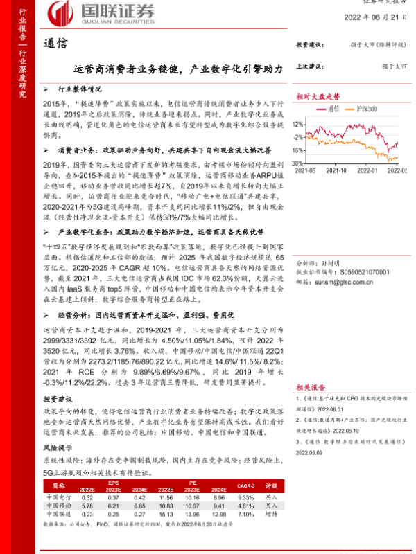 【国联证券】【20220621】通信行业:运营商消费者业务稳健,产业数字化引擎助力-43页 行业研究