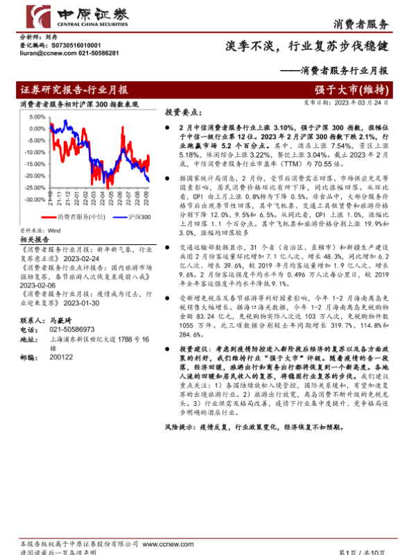【中原证券】【20230324】消费者服务行业月报:淡季不淡,行业复苏步伐稳健-10页 行业研究