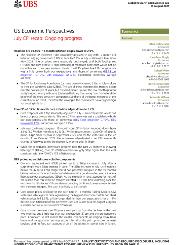 【UBS Brasil CCTVM S.A.】【20240814】US Economic Perspectives July CPI recap Ongoing progress-14页 行业研究