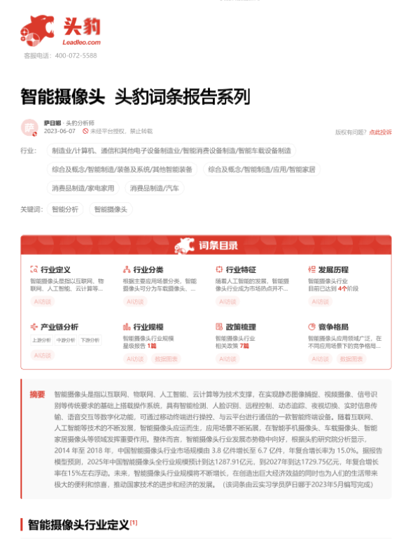 【头豹研究院】【202309】智能摄像头 头豹词条报告系列-27页 行业研究