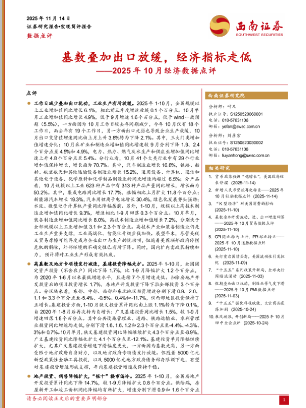 【西南证券】【202511】2025年10月经济数据点评:基数叠加出口放缓,经济指标走低-7页 证券期货研究报告