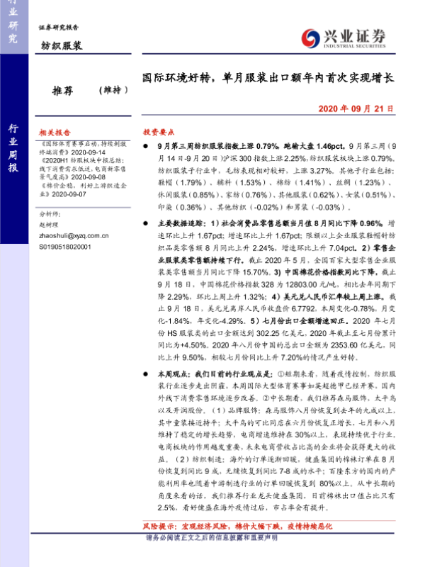 【兴业证券】【20200921】20200921-兴业证券-纺织服装行业周报:国际环境好转,单月服装出口额年内首次实现增长-13页 行业研究