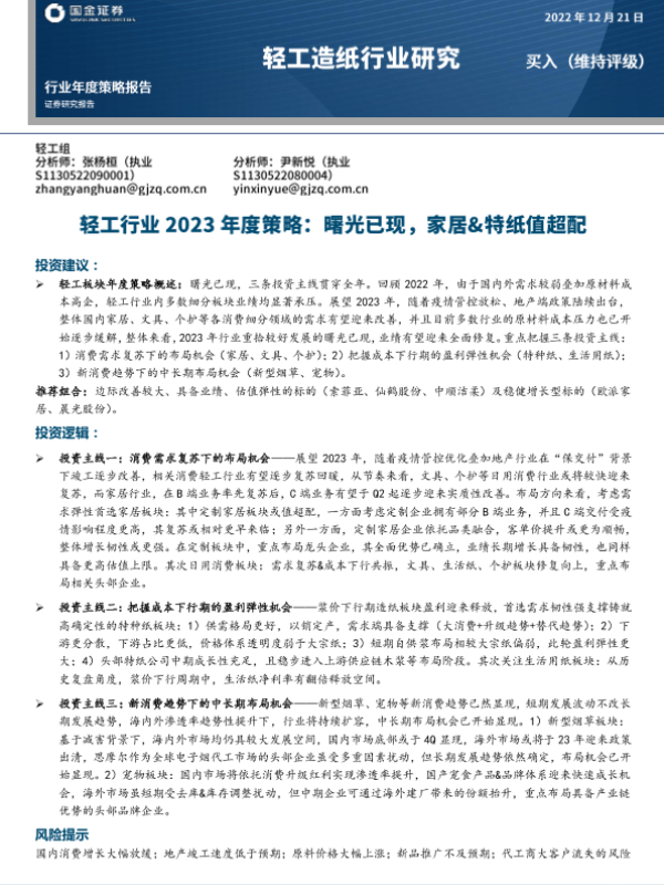 【国金证券】【20221221】轻工行业2023年度策略:曙光已现,家居&特纸值超配-37页 行业研究