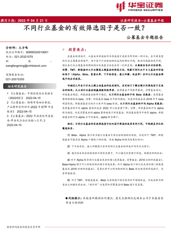 【华宝证券】【20220421】公募基金专题报告:不同行业基金的有效筛选因子是否一致?-23页 行业研究