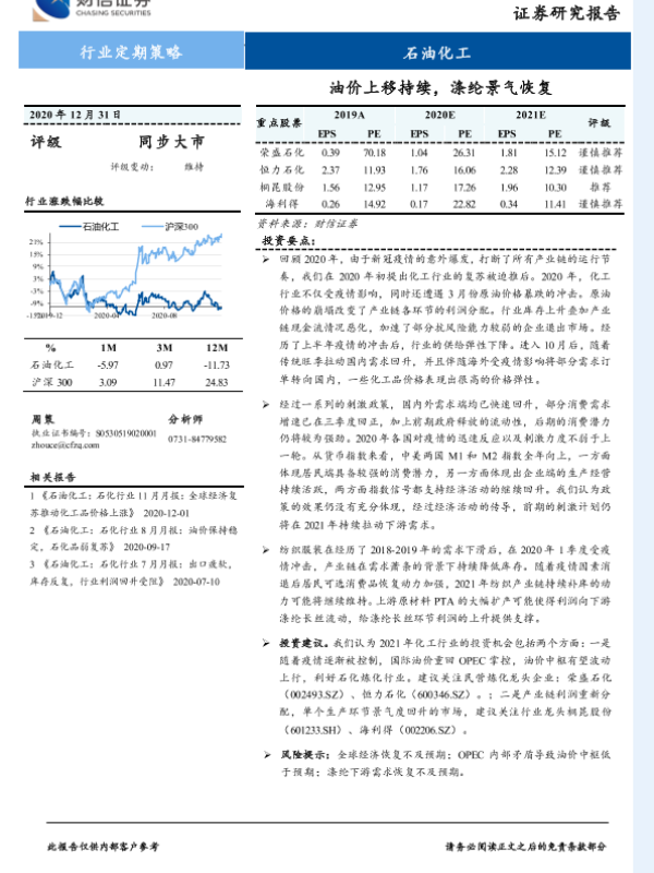 【财信证券】【20201231】石油化工行业:油价上移持续,涤纶景气恢复-20页 行业研究