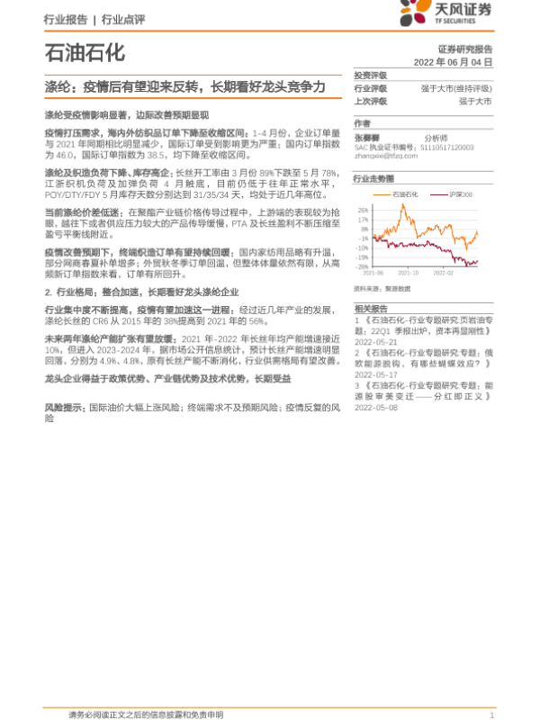【天风证券】【20220604】石油石化行业点评:涤纶:疫情后有望迎来反转,长期看好龙头竞争力-7页 行业研究