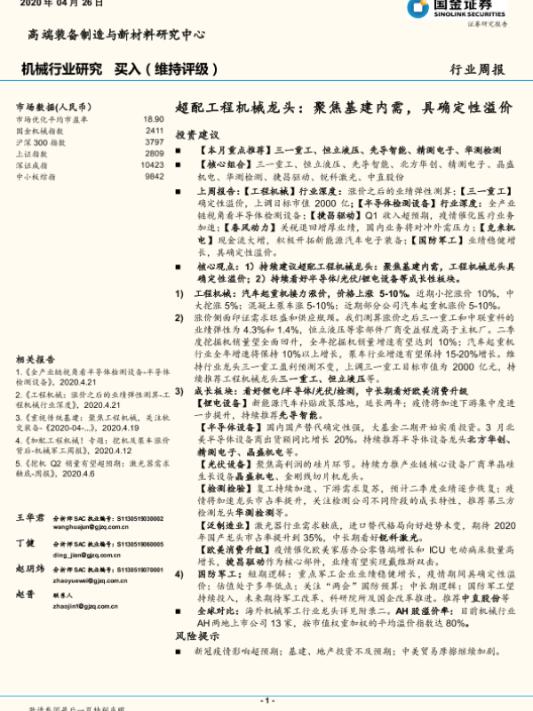 【国金证券】【20200426】20200426-国金证券-机械行业研究:超配工程机械龙头:聚焦基建内需,具确定性溢价-22页 行业研究