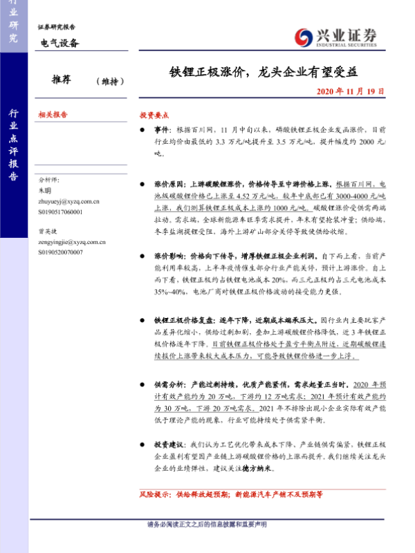 【兴业证券】【20201119】电气设备行业点评报告:铁锂正极涨价,龙头企业有望受益-8页 行业研究