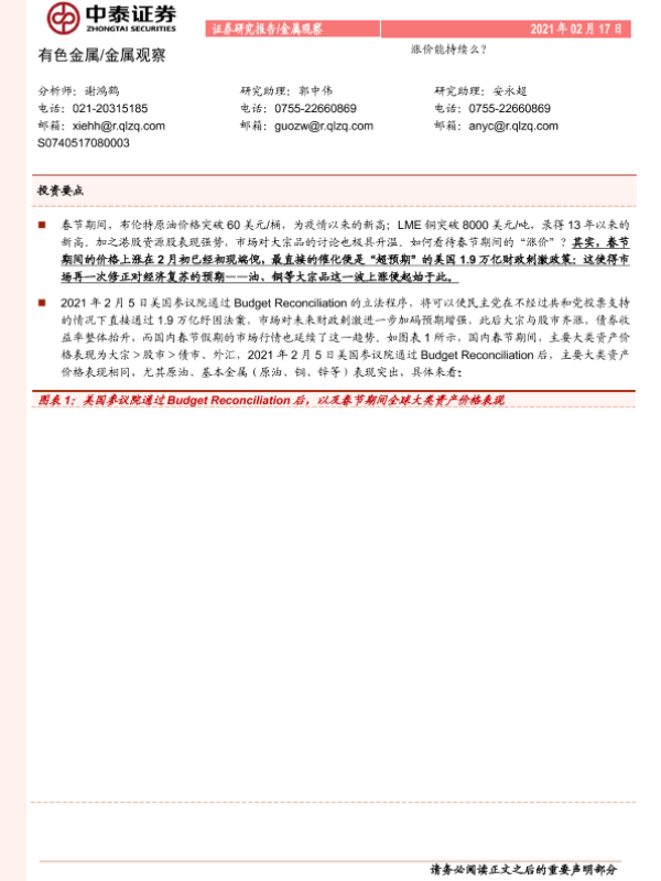 【中泰证券】【20210217】有色金属 金属观察:涨价能持续么?-8页 行业研究