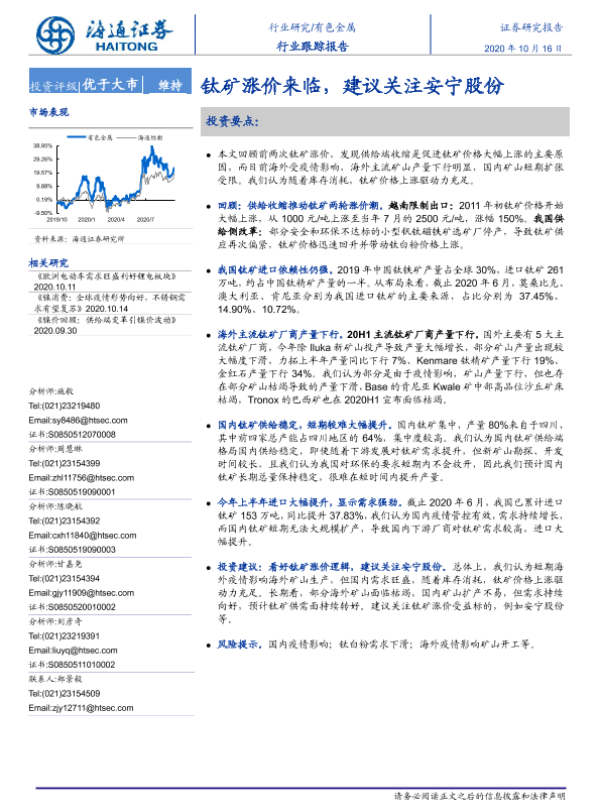 【海通证券】【20201016】20201016-海通证券-有色金属行业跟踪报告:钛矿涨价来临,建议关注安宁股份-13页 行业研究