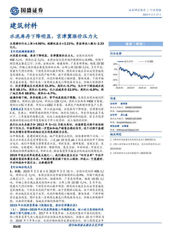 【国盛证券】【20190317】建筑材料行业周报:水泥库存下降明显,京津冀涨价压力大-23页 行业研究
